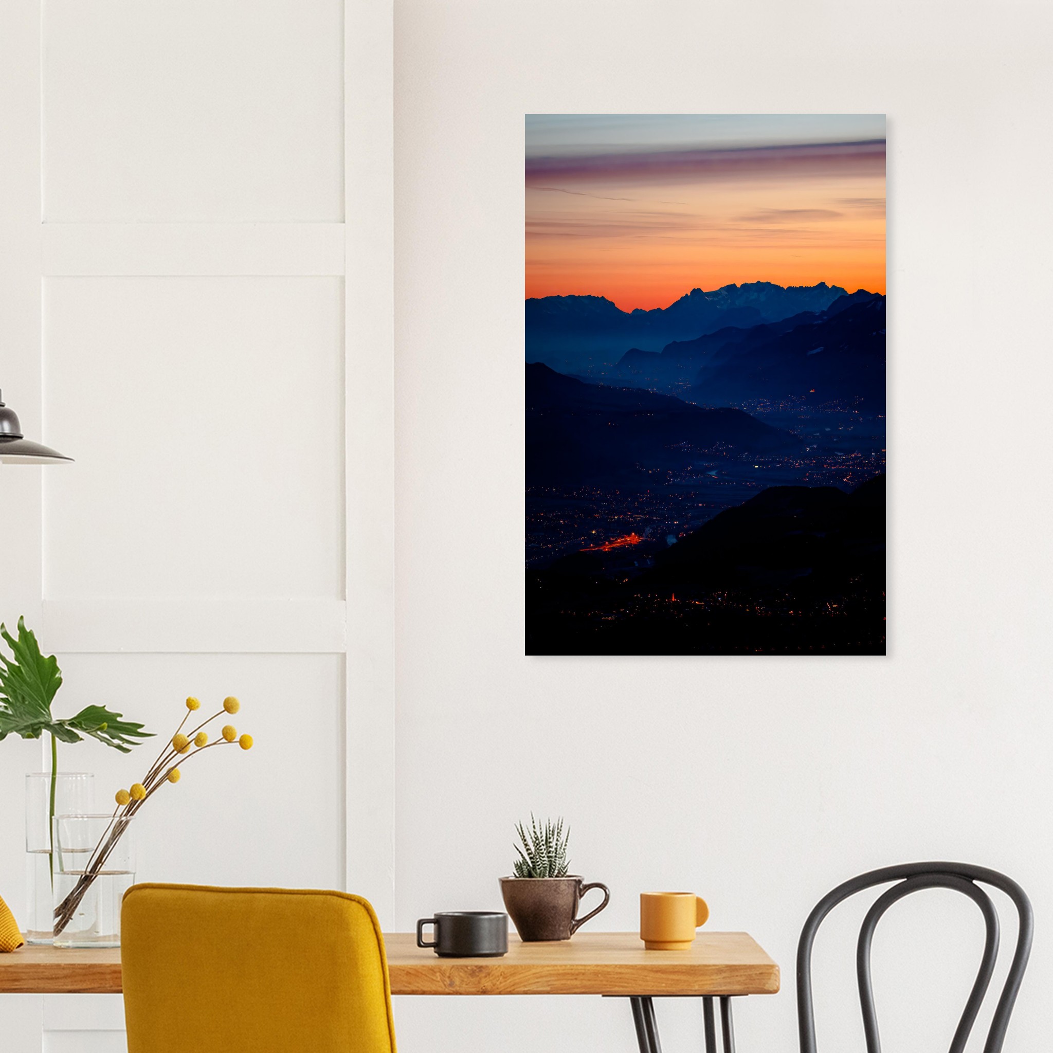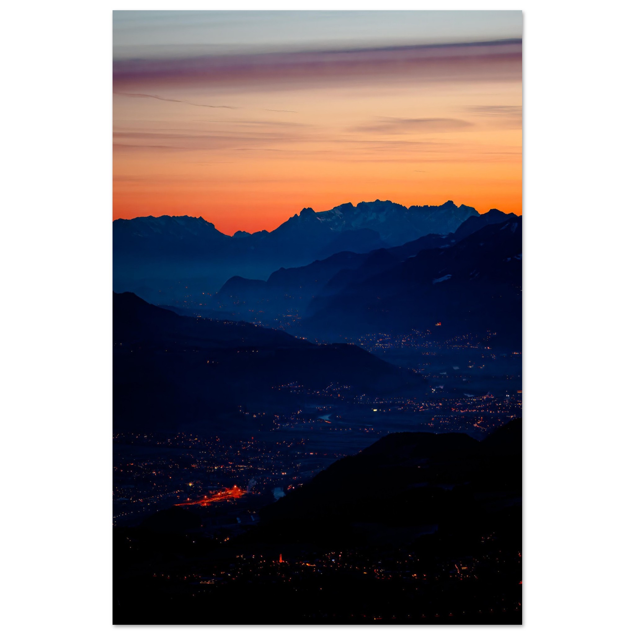 Die Nacht liegt noch im Tal und hinter den Bergen kündigt sich ein neuer Morgen an. Mit weichen Pastellfarben übernimmt der neue Tag und vertreibt die Dunkelheit aus dem Inntal. Die letzten Lichter heben noch die Ortschaften und Verkehrswege hervor, bevor der quirrlige Alltag im Inntal beginnt.
