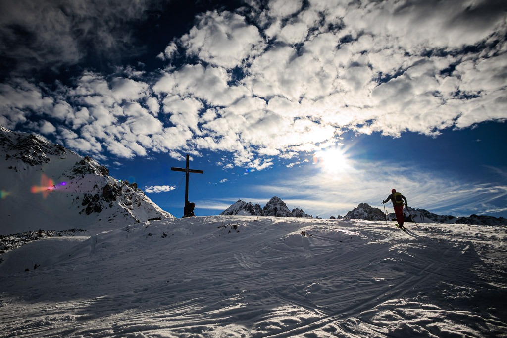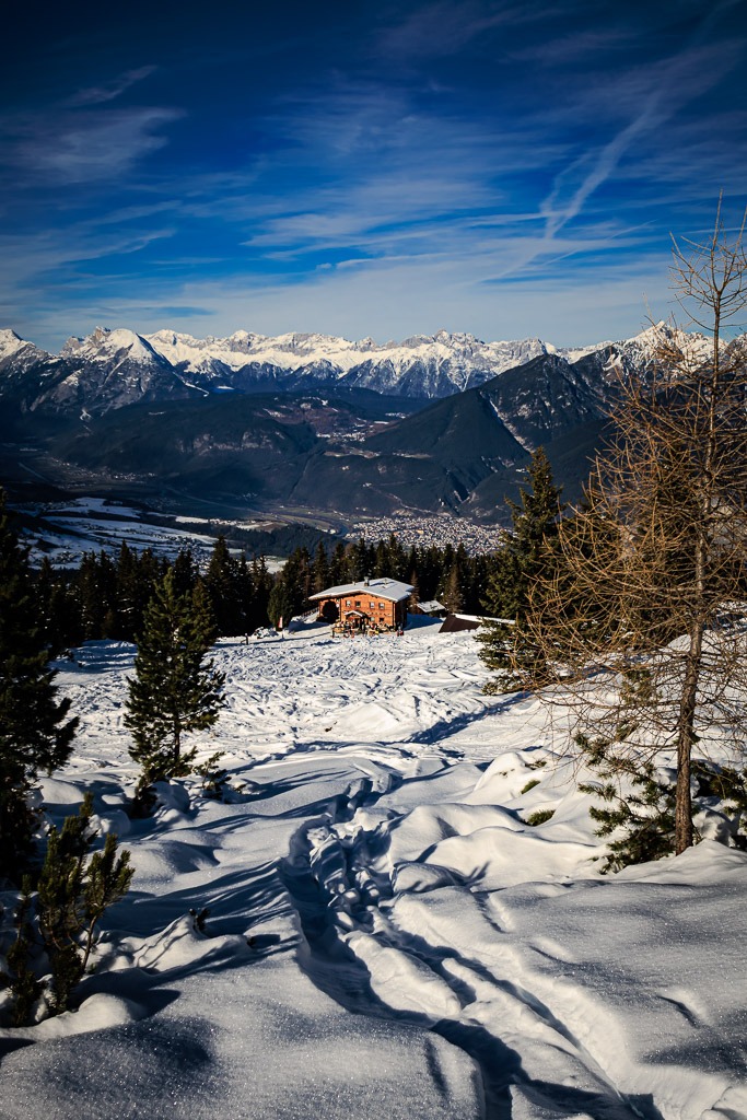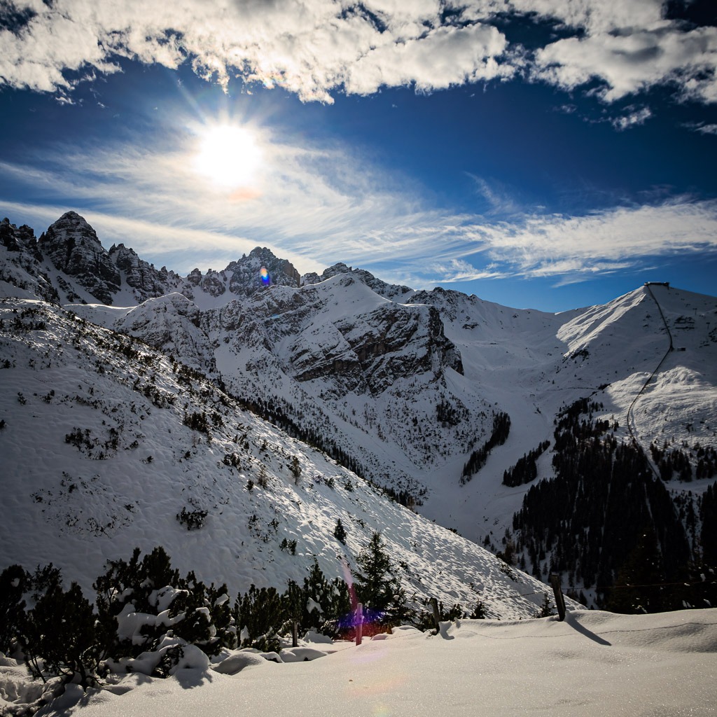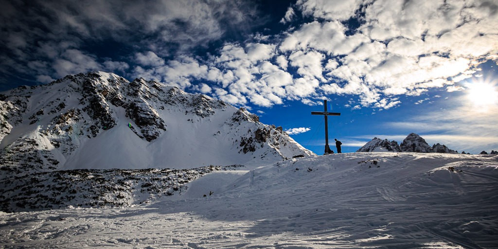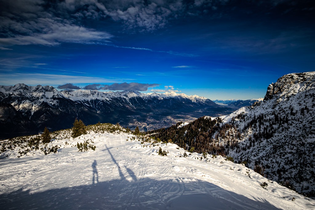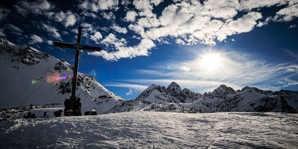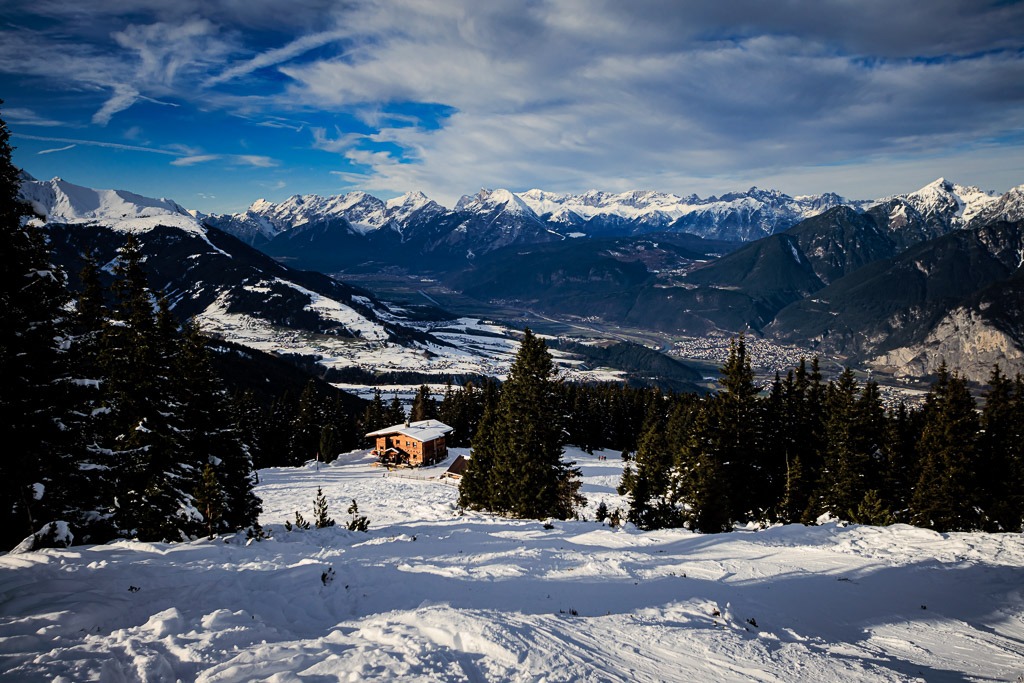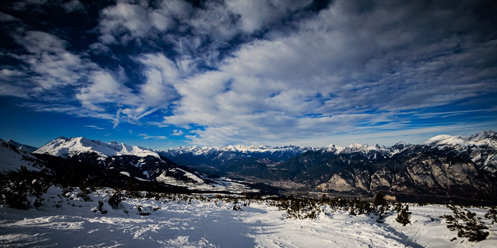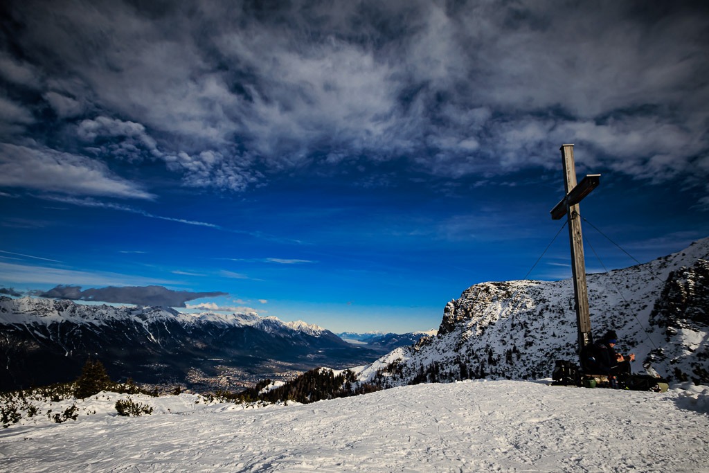 Nach einer Verschnaufpause und einer optionalen, kleinen Stärkung gehts nun auf Schneeschuhen weiter aufwärts. Durch immer lichteren Bergwald öffnet sich unser Panorama immer mehr, bis wir schließlich vom Birgitzköpfl eine traumhafte Rundumsicht haben. Südlich steht die beeindruckende Nockspitze vor uns, östlich liegen die Kalkkögel und das Skigebiet der Axamer Lizum vor uns. Weiter reicht der Blick über das Inntal bis Innsbruck, nordseitig begrenzt vom Karwendel und Wetterstein mit der Zugspitze als „Highlight“.